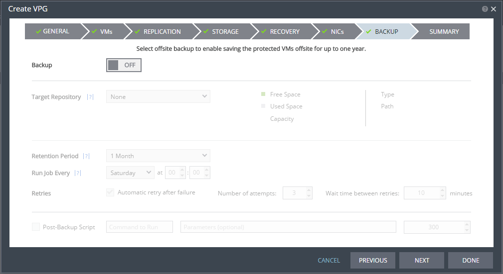 The BACKUP step is displayed. Backup properties govern the VPG backup, including the repository where the backups are saved. Backup extends the ability to recover virtual machines in a VPG going back one year.