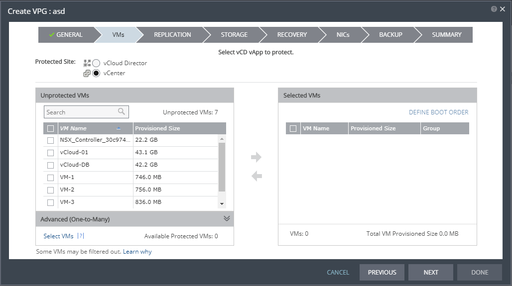 Note: Virtual machines can be protected in a maximum of three VPGs. These VPGs cannot be recovered to the same site. Virtual machines protected in the maximum number of VPGs are not displayed in the Select VMs dialog.
