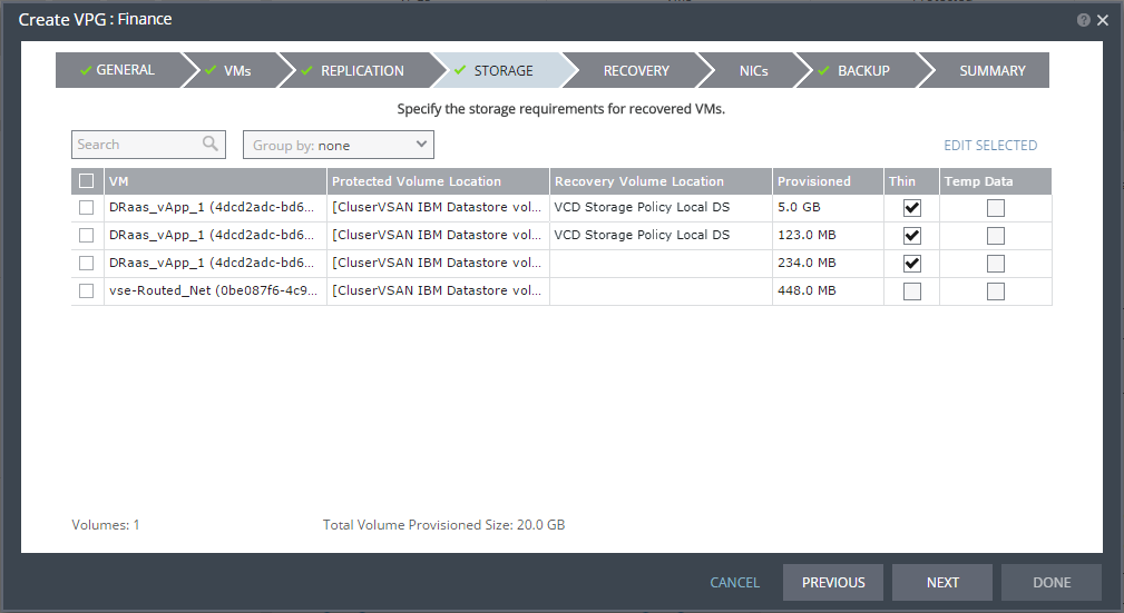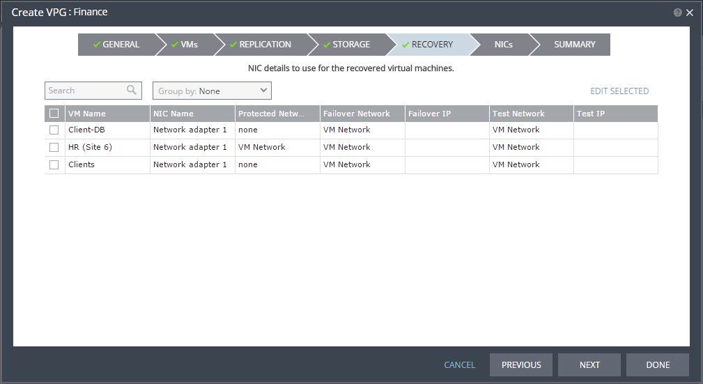 Note: Steps that do not require input are marked with a check mark. You can jump directly to a step that has been marked with a check mark to edit the values for that step. Every step must be marked with a check mark before you can click DONE to create the VPG.
