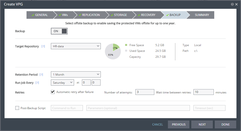The BACKUP step is displayed. Backup properties govern the VPG backup, including the repository where the backups are saved. Backup extends the ability to recover virtual machines in a VPG for up to one year.