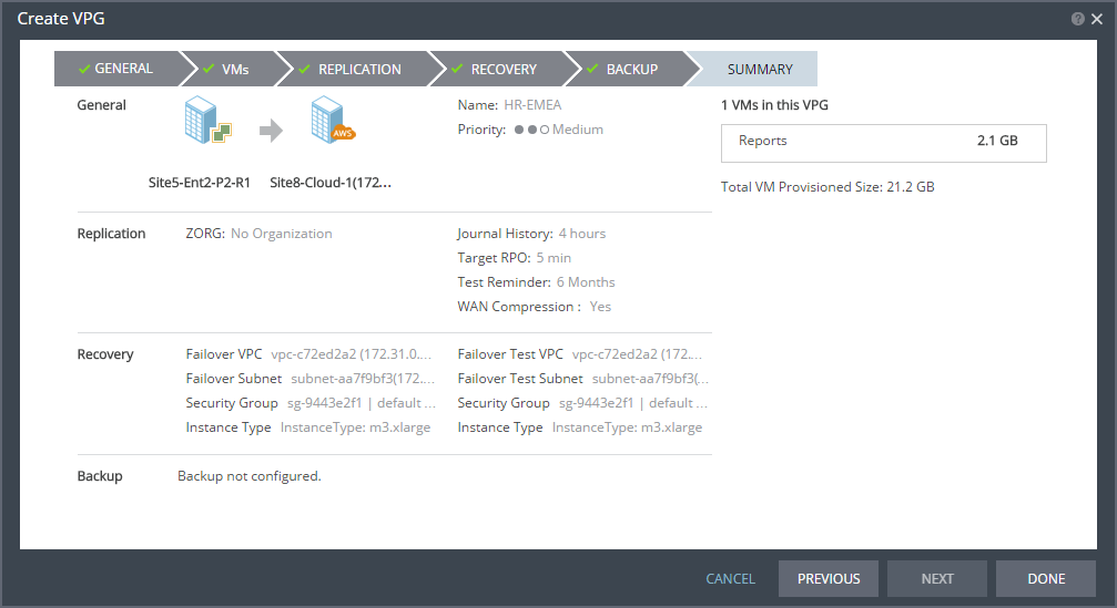 Note: Steps that do not require input are marked with a check mark. You can jump directly to a step that has been marked with a check mark to edit the values for that step. Every step must be marked with a check mark before you can click DONE to create the VPG.