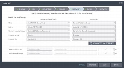 The RECOVERY step is displayed. Recovery details include the networks, network security group, instance family, and instance size to use for failover, move, and testing failover, and whether scripts should run as part of the recovery process.