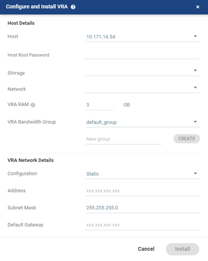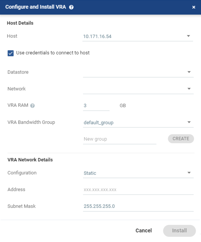 Host: The host under which the VRA is installed. The drop-down displays the hosts which do not have a VRA installed, with the selected host displayed by default. |