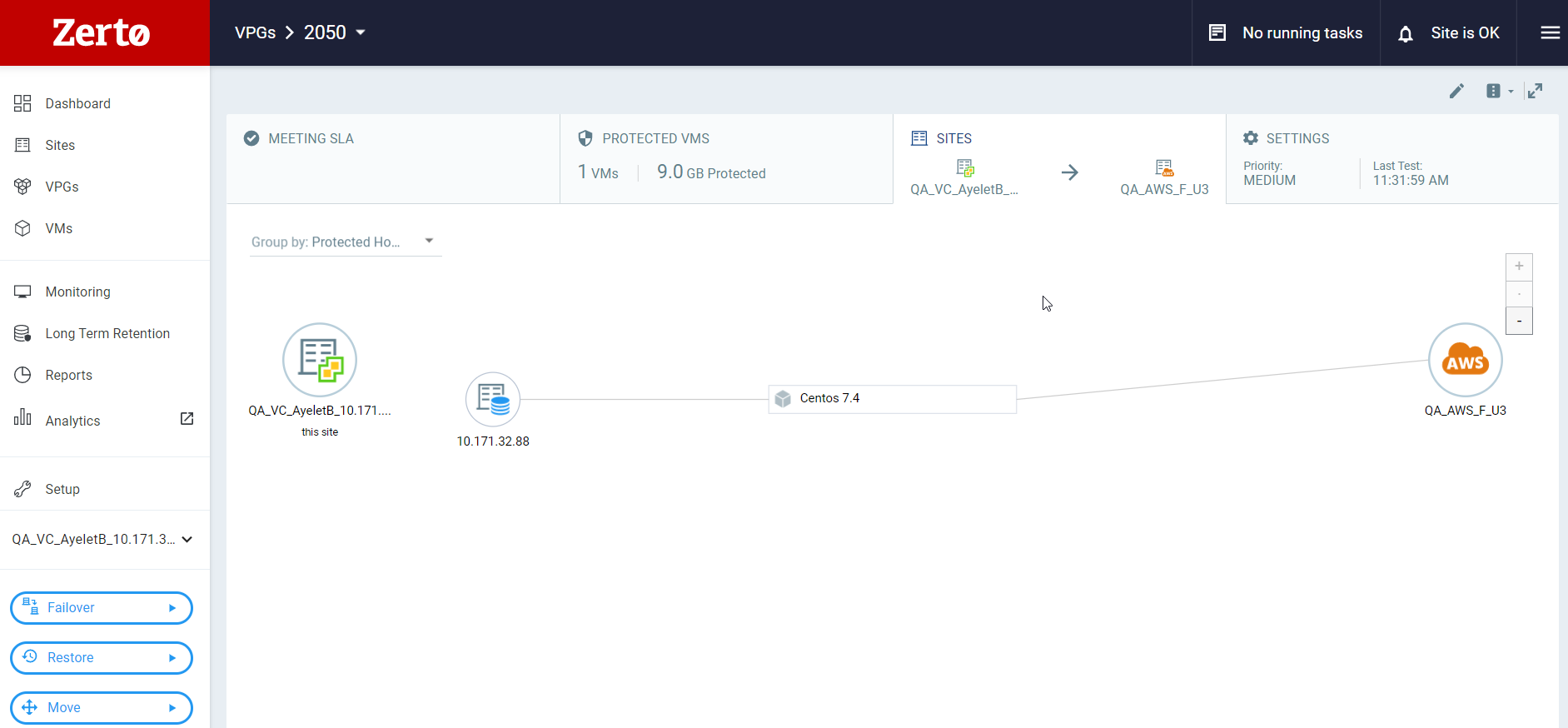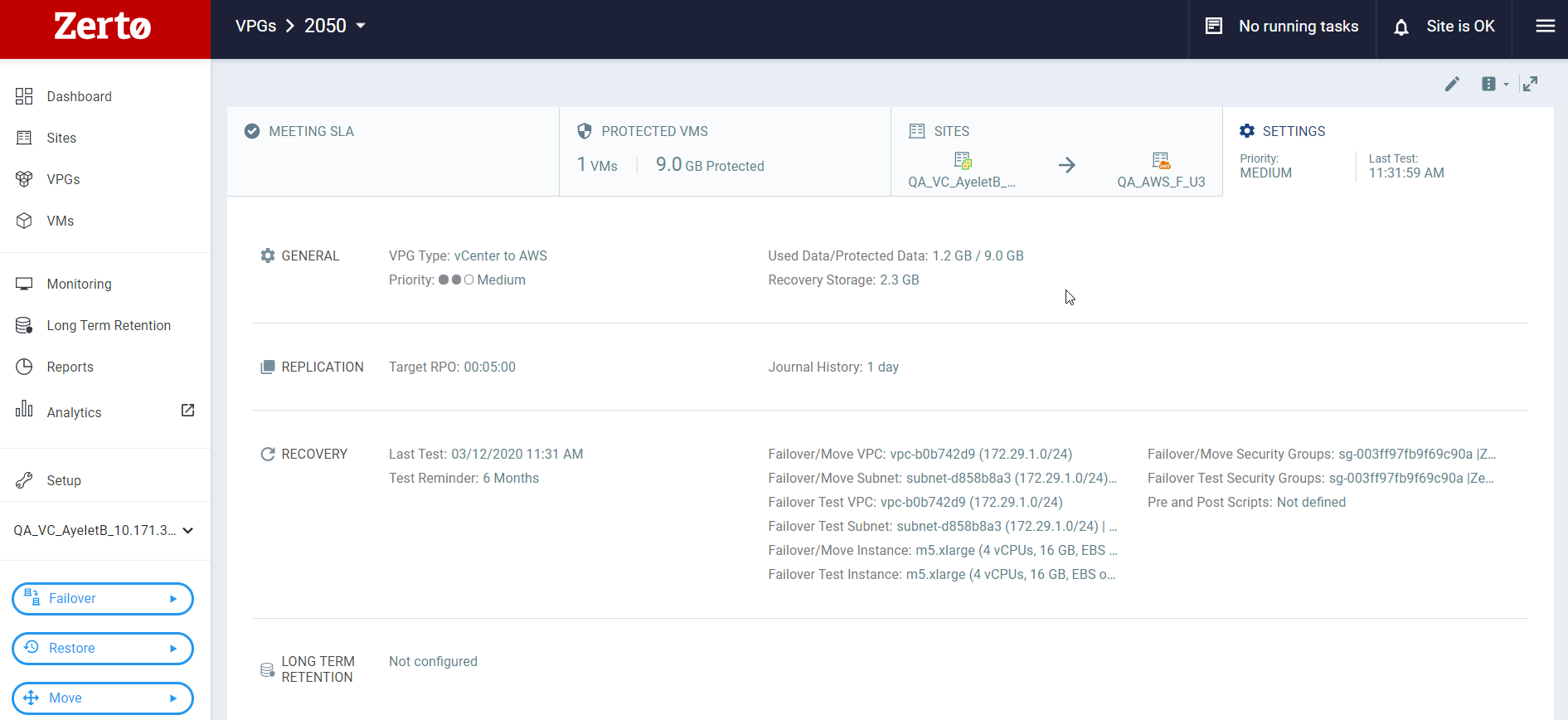 RPO: The current Recovery Point Objective (RPO) of the Virtual Protection Group (VPG).