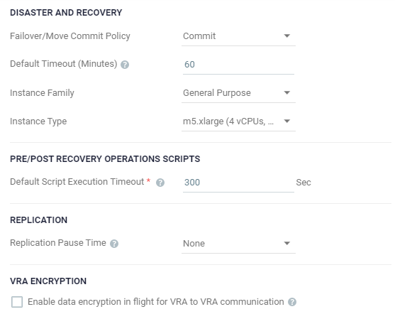 Specify the Default Script Execution Timeout or a script running before or after the failover, move, or test failover. A value of zero indicates that there is no time out. Values can be between 300 to 6000 seconds. |