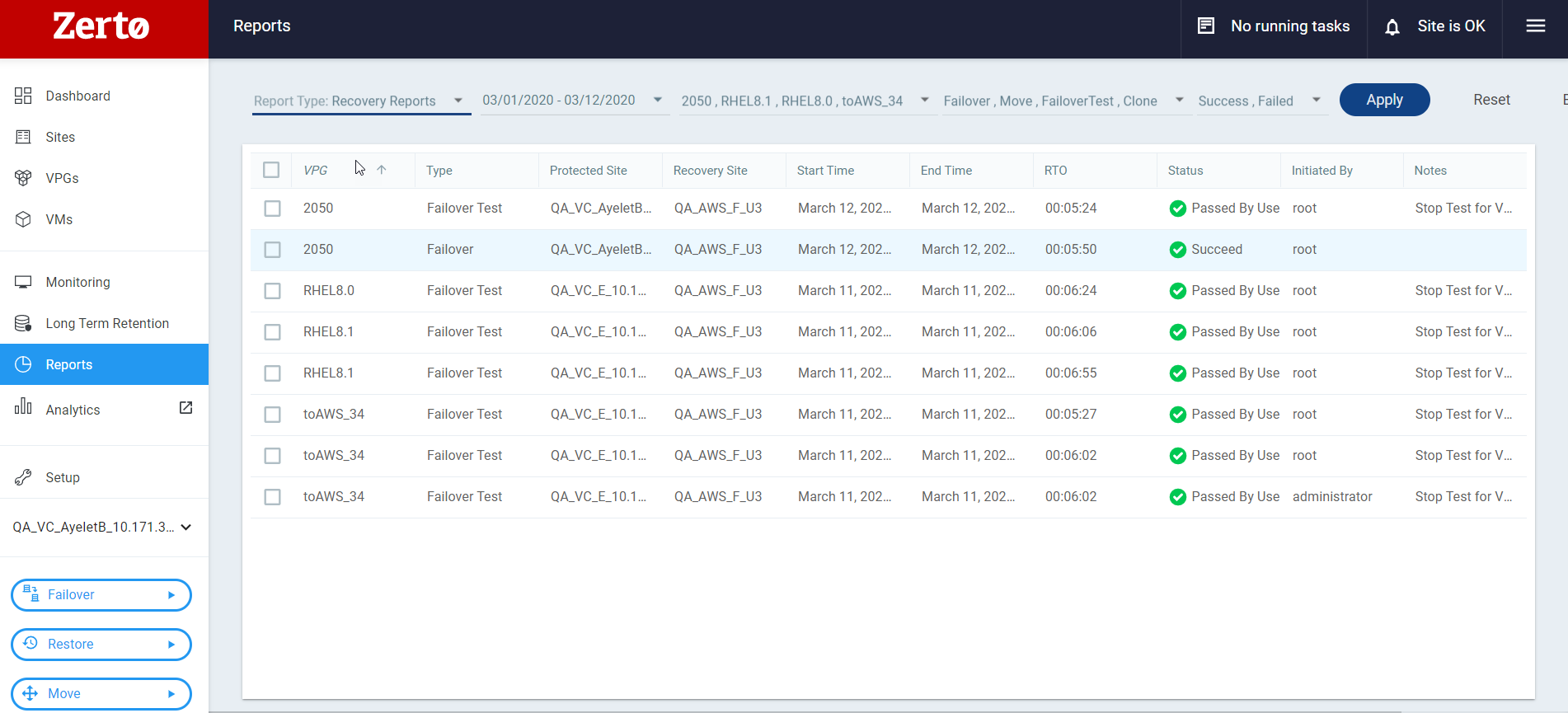 Information about recovery operations — failover tests, moves, and failovers — can be displayed in Recovery Reports under the REPORTS tab.