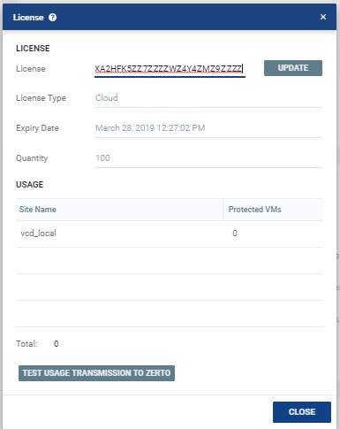 | 4. | Select License, then click TEST USAGE TRANSMISSION TO ZERTO. |
