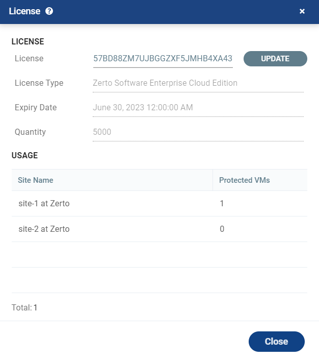 The Zerto license includes information such as the number of virtual machines that can be protected and the license expiry date. You can see these details by clicking