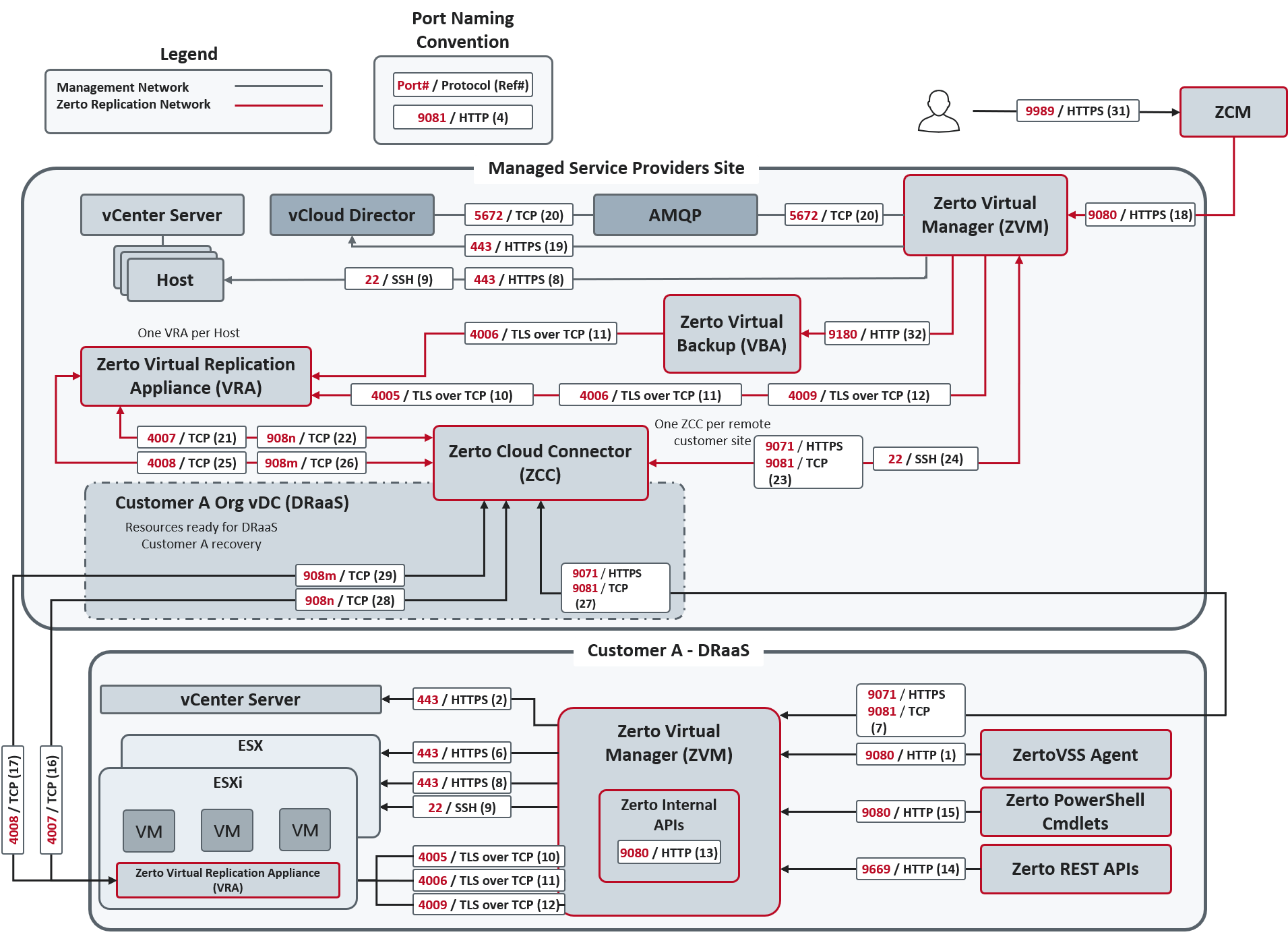 | 22 | 9, 24 | During Virtual Replication Appliance (VRA) installation on ESXi 5.1 and higher for communication between the Zerto Virtual Manager (ZVM) and the ESXi hosts IPs and for ongoing communication between the ZVM in the cloud site – but not the customer site – and a Zerto Cloud Connector. | |||||||||