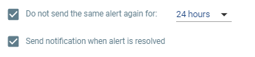 Do not send the same alert again for: Select this to stop the same alert type/severity/status being sent repeatedly within the selected time frame. |