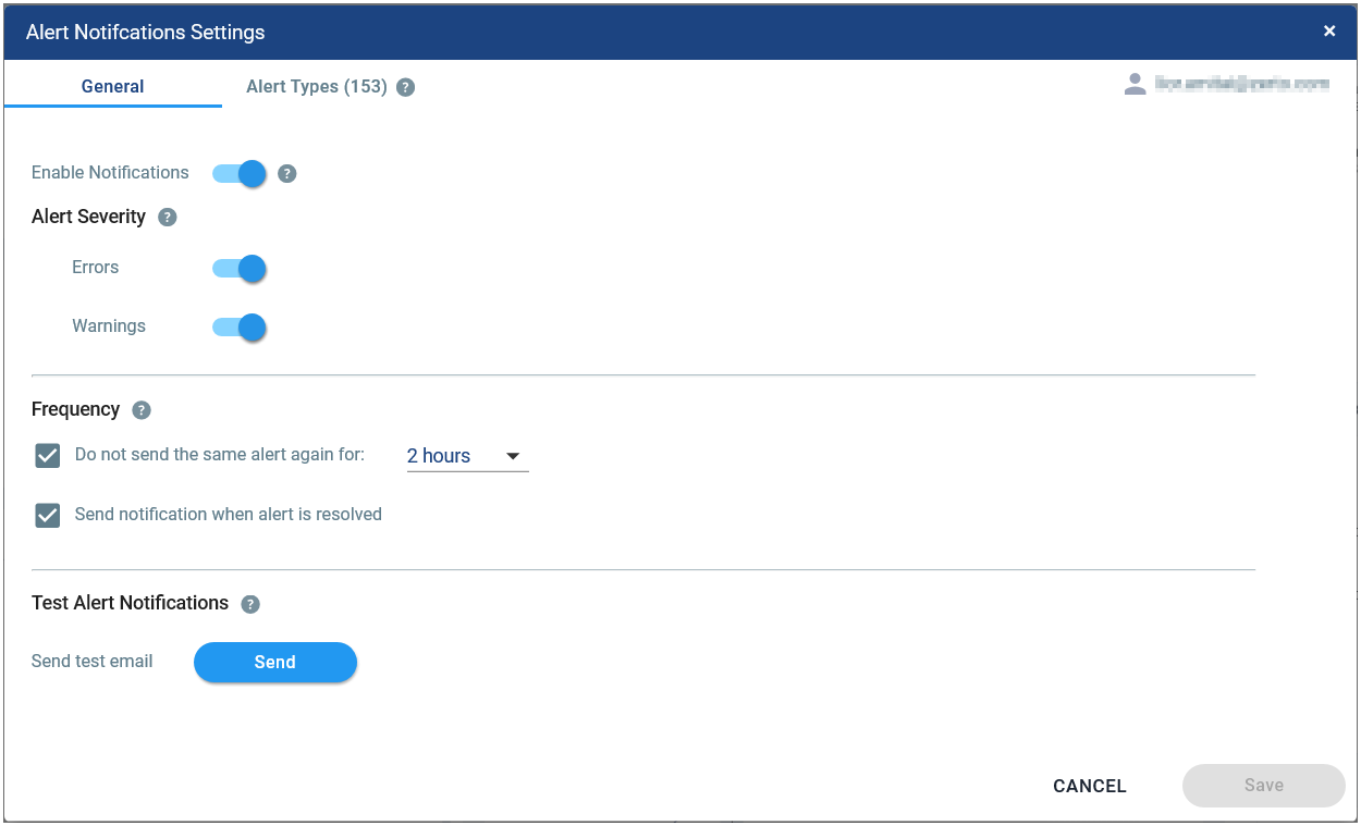 Using Alert Notifications settings, you can modify notification settings based on alert type, severity, and frequency.